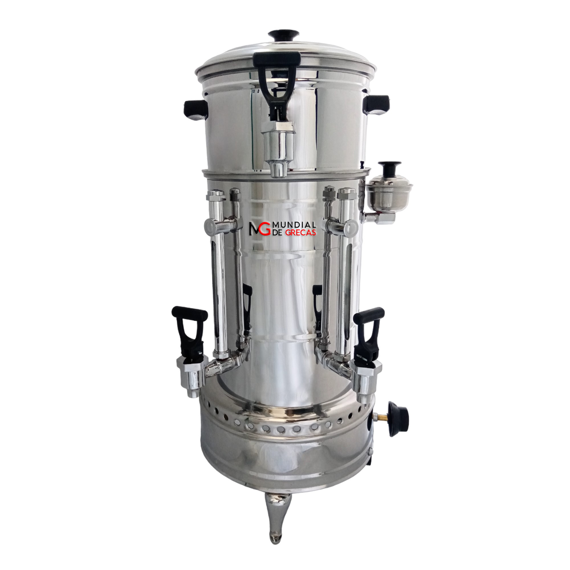 El modelo 300 G o de 30 tintos gas, está fabricado en acero 430 Brillante calibre 26. Cuenta con tres servicios (Café, Agua y Leche, Llaves de chupa tipo Italiana. Recipiente en acero. Porta niveles en Aluminio. Adecuación para Gas natural o Propano. Sistema de gas de seguridad (válvula y quemador para uso industrial), botón regulador de salida de gas. Salida para conexión de gas de 3/8 Hembra.- Incluye aro y 1 filtro para el café.